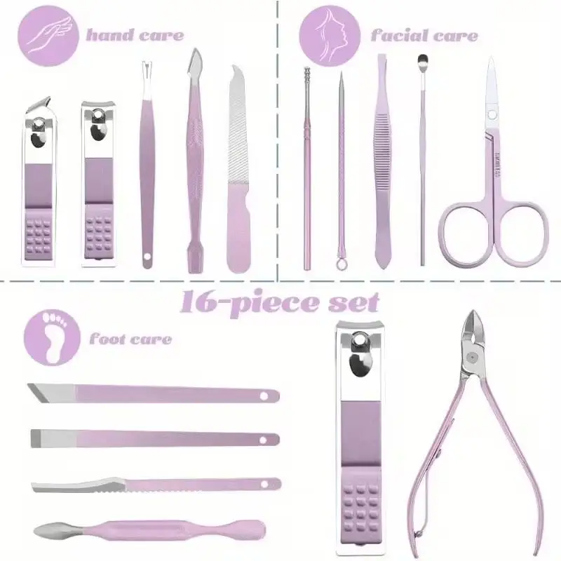 1.This comprehensive kit includes 16 rustproof, ultra-sharp tools—from standard nail clippers to precision cuticle nippers—crafted from medical-grade stainless steel for lasting hygiene and performance.