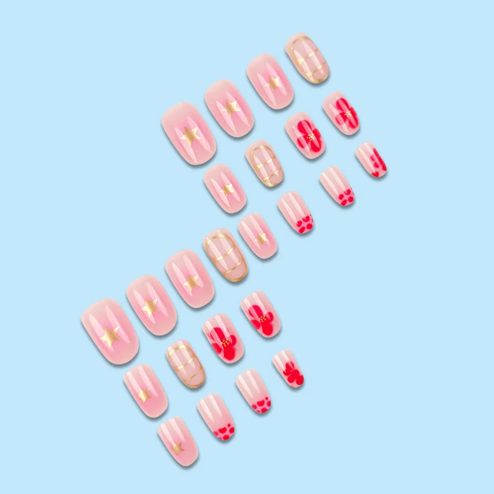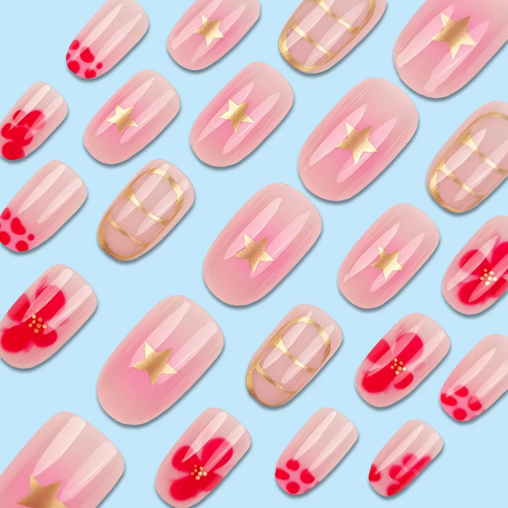 24 Pcs Nail Tips Short Round Flower Decoration for Nails